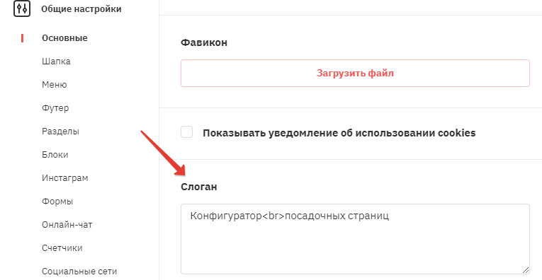 Чтобы добавить описание слогана, необходимо зайти в общие настройки и оставаясь основных настройках найти пункт 'Слоган'